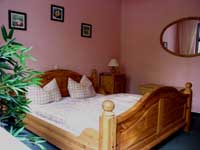 Im Schlafzimmer: Großes Doppelbett und Nachtschränke.
